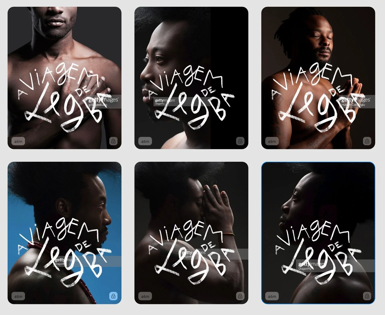 Abrindo o nosso processo: acima as diferentes capas que nosso time de UX desenvolveu para a série Viagem de Legba, antes de optar pela capa final.